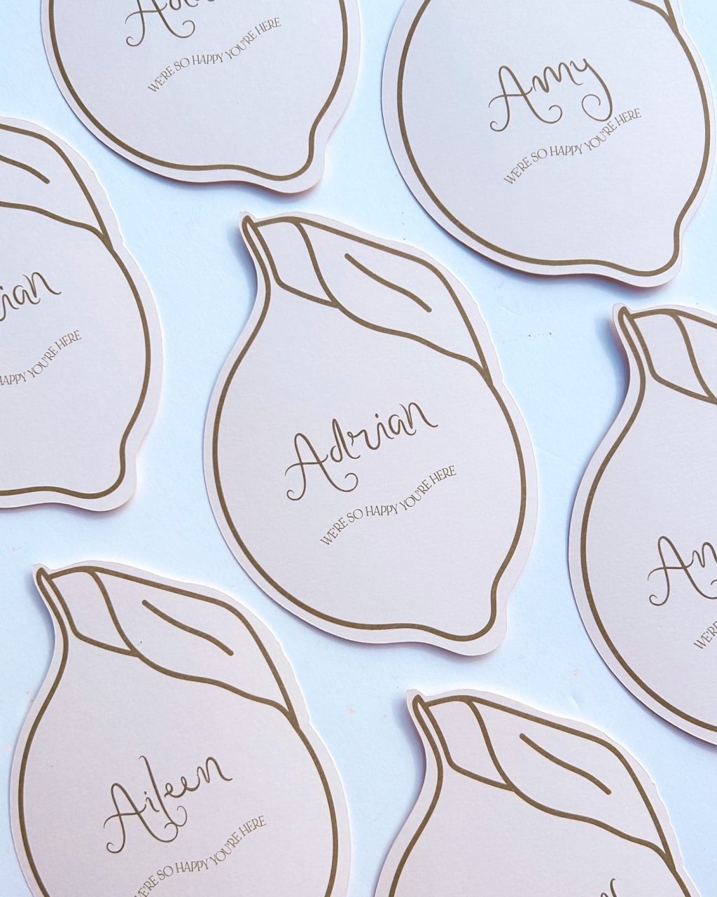 Lemon-Shaped Wedding Place Cards with Minimalist Outline Design