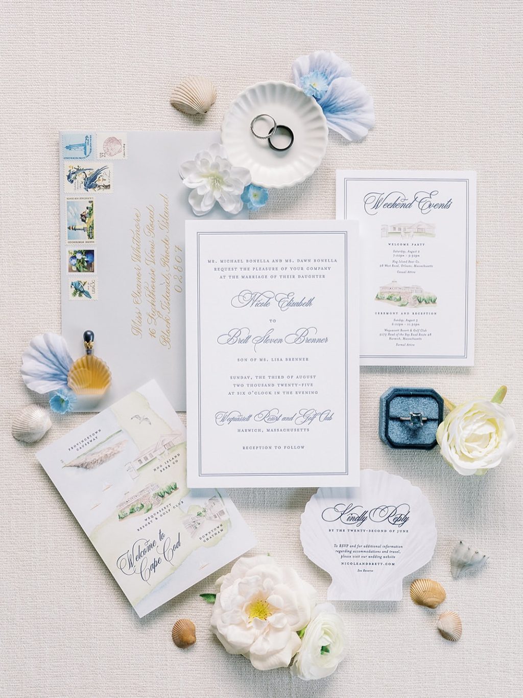Coastal Wedding Invitation Suite with Illustrated Map and Seashell RSVP