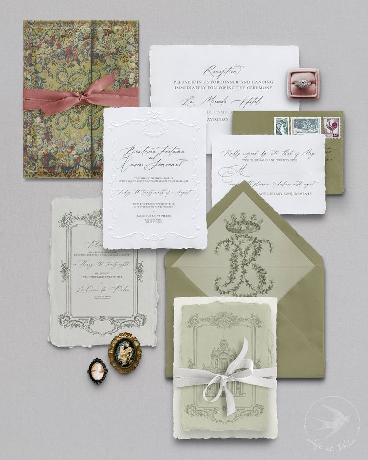 Vintage French wedding invitation suite with ornate details