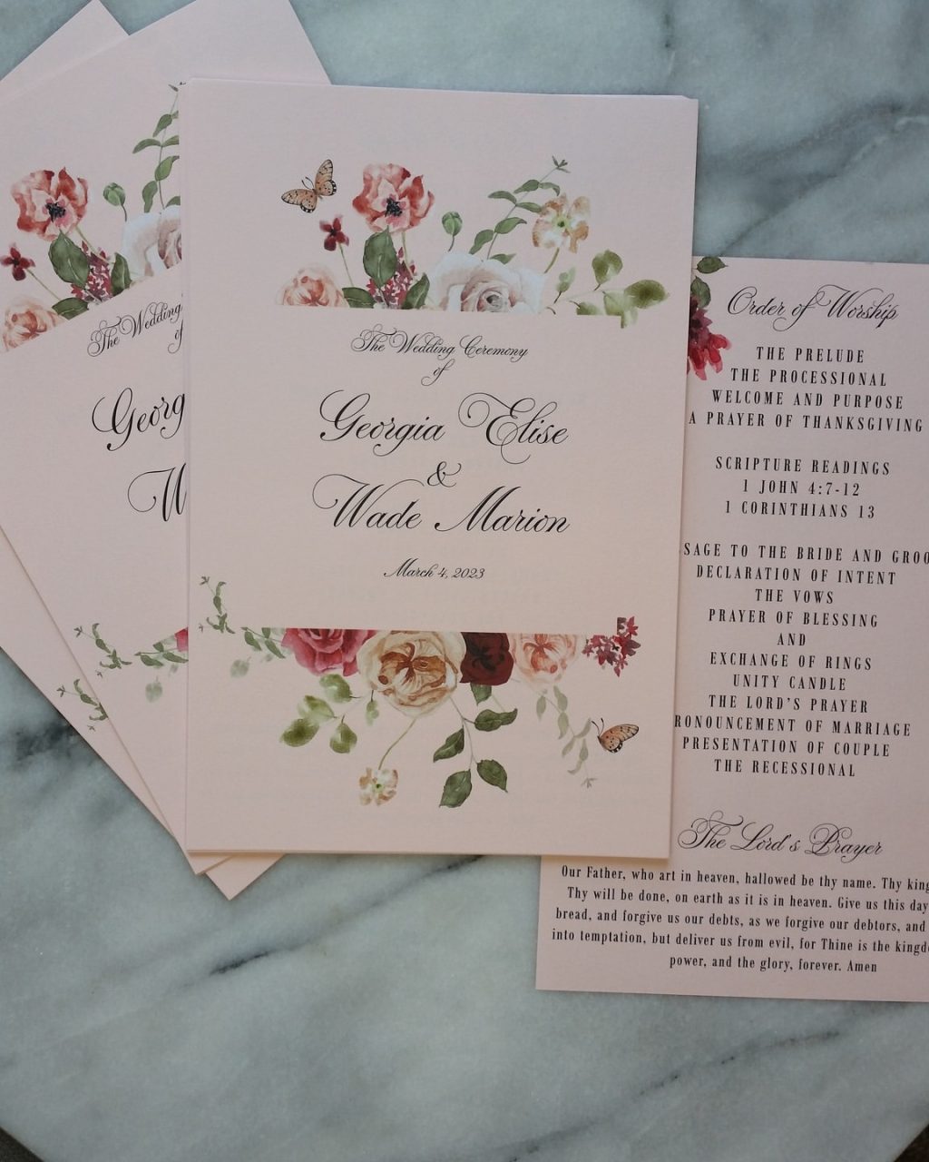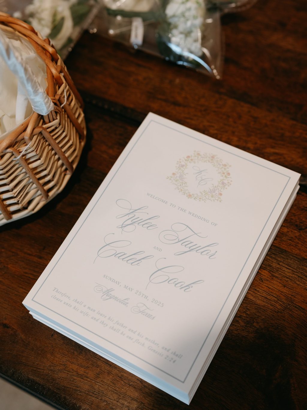 Floral wedding ceremony program with elegant calligraphy