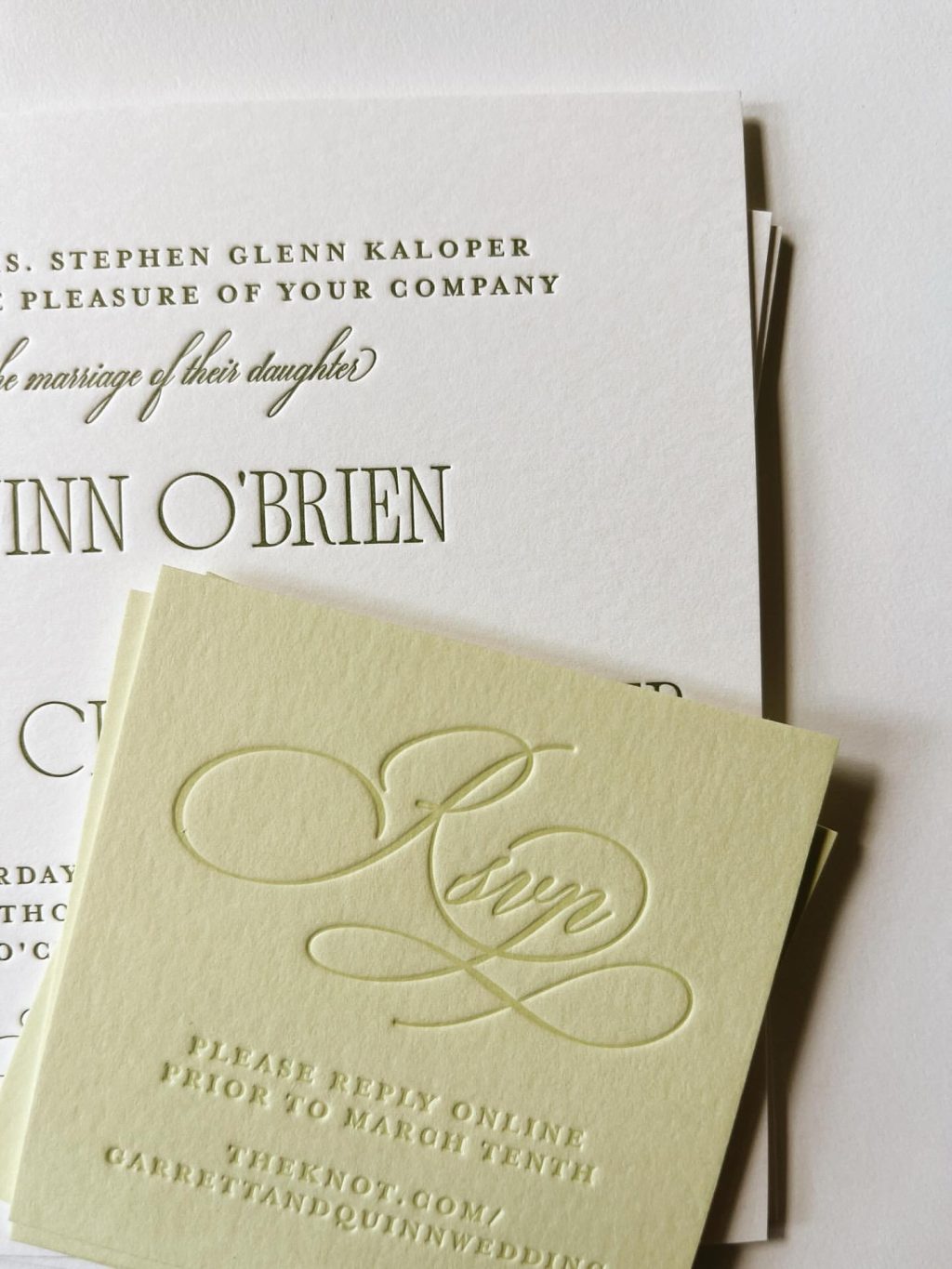 Elegant embossed wedding invitation with RSVP card in cream