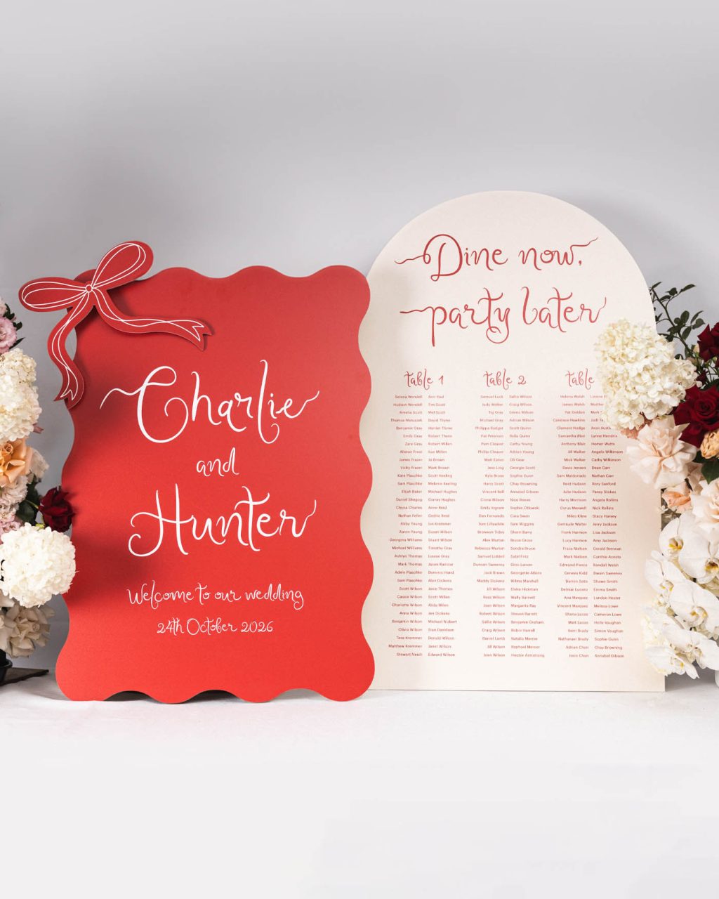 Red wedding welcome sign and seating chart with modern calligraphy