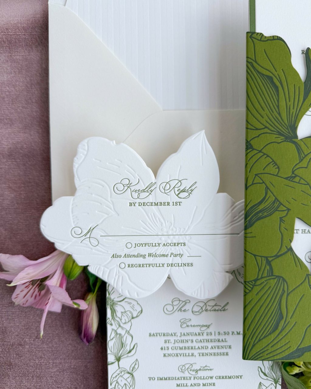 Floral RSVP Card – Elegant Cutout with Embossed Petals & Script Calligraphy