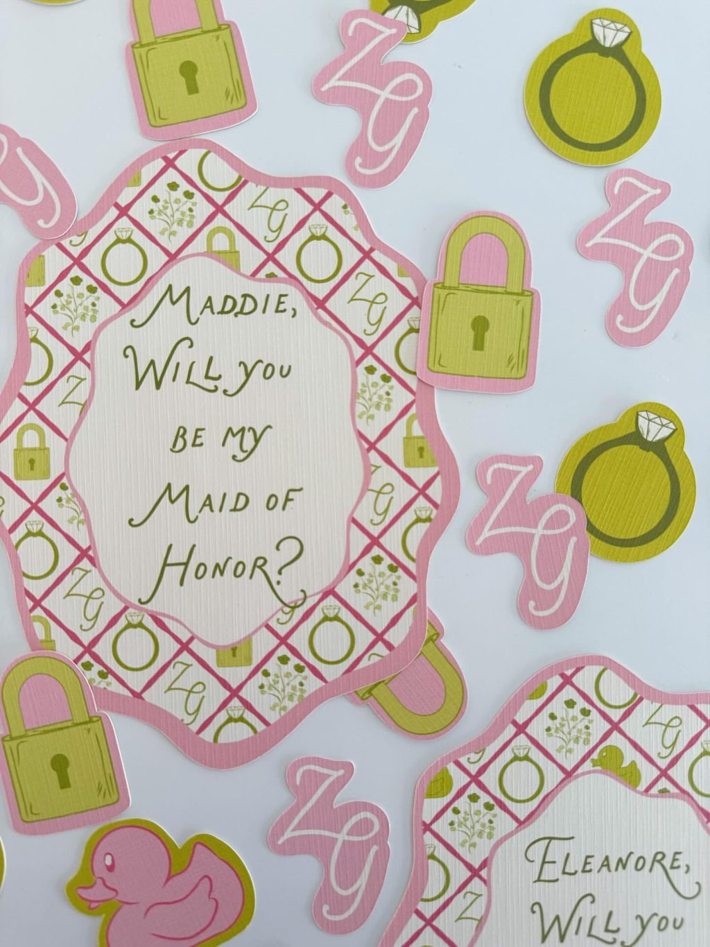 Colorful Maid of Honor proposal card with playful pink and green design
