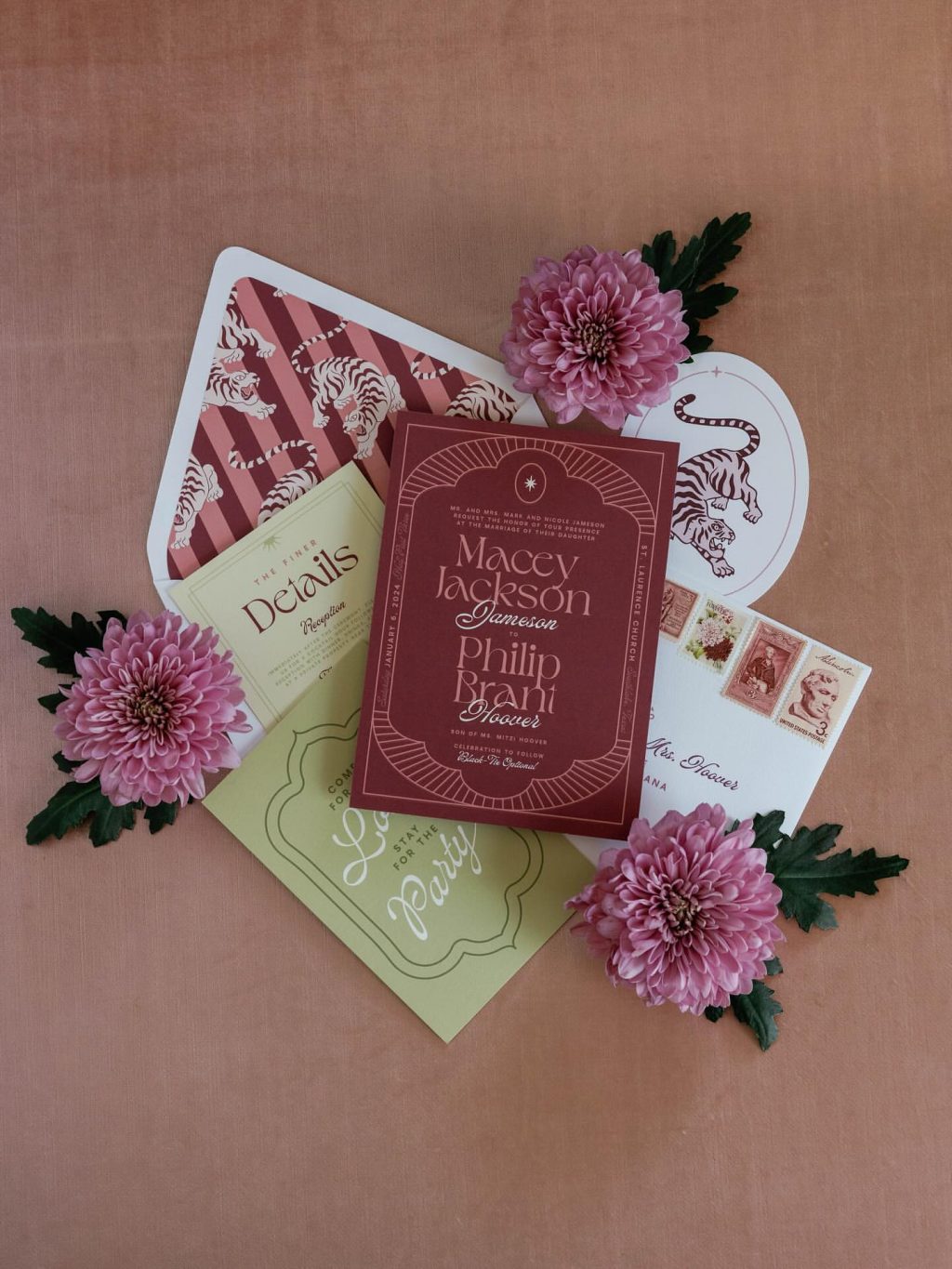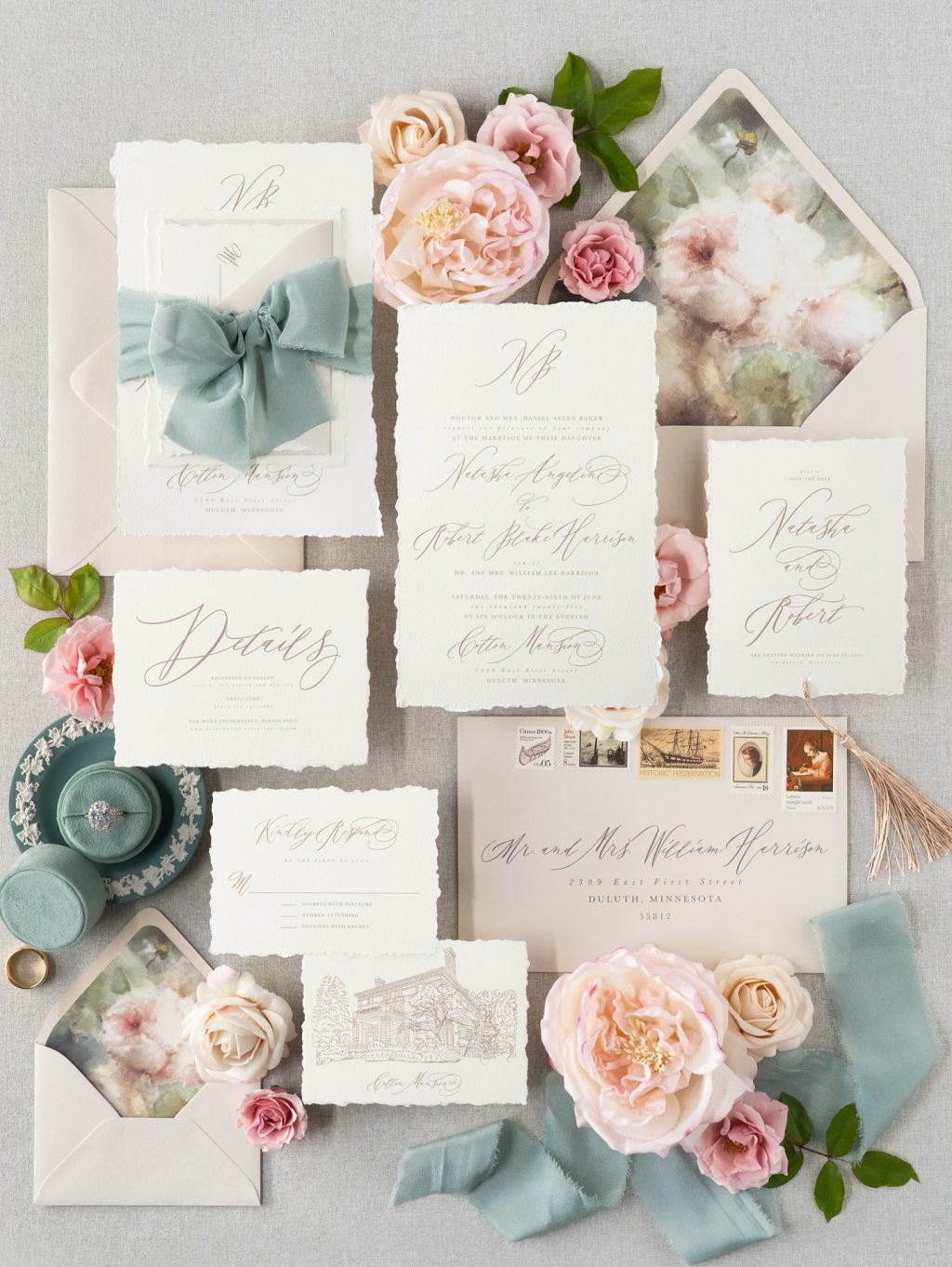 Romantic wedding invitation suite with calligraphy and floral details