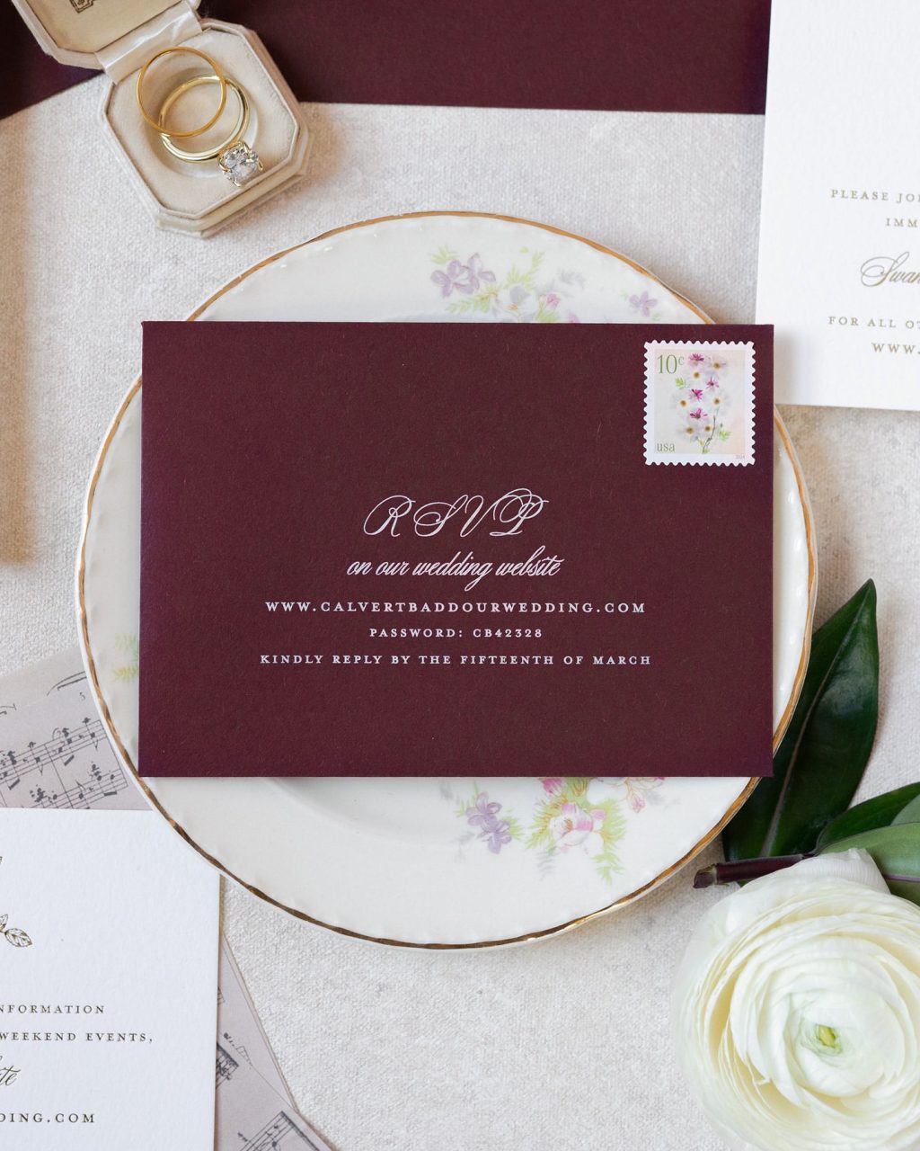 Burgundy RSVP envelope with elegant wedding calligraphy