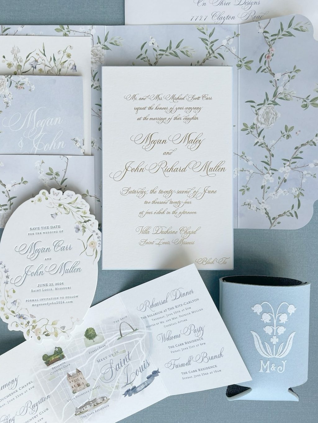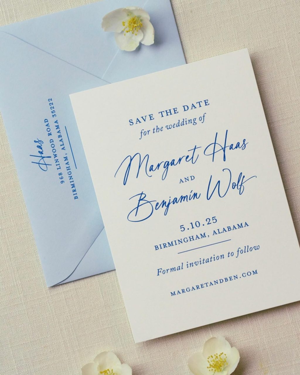 Save the Date Wedding Invitation with Elegant Blue Calligraphy