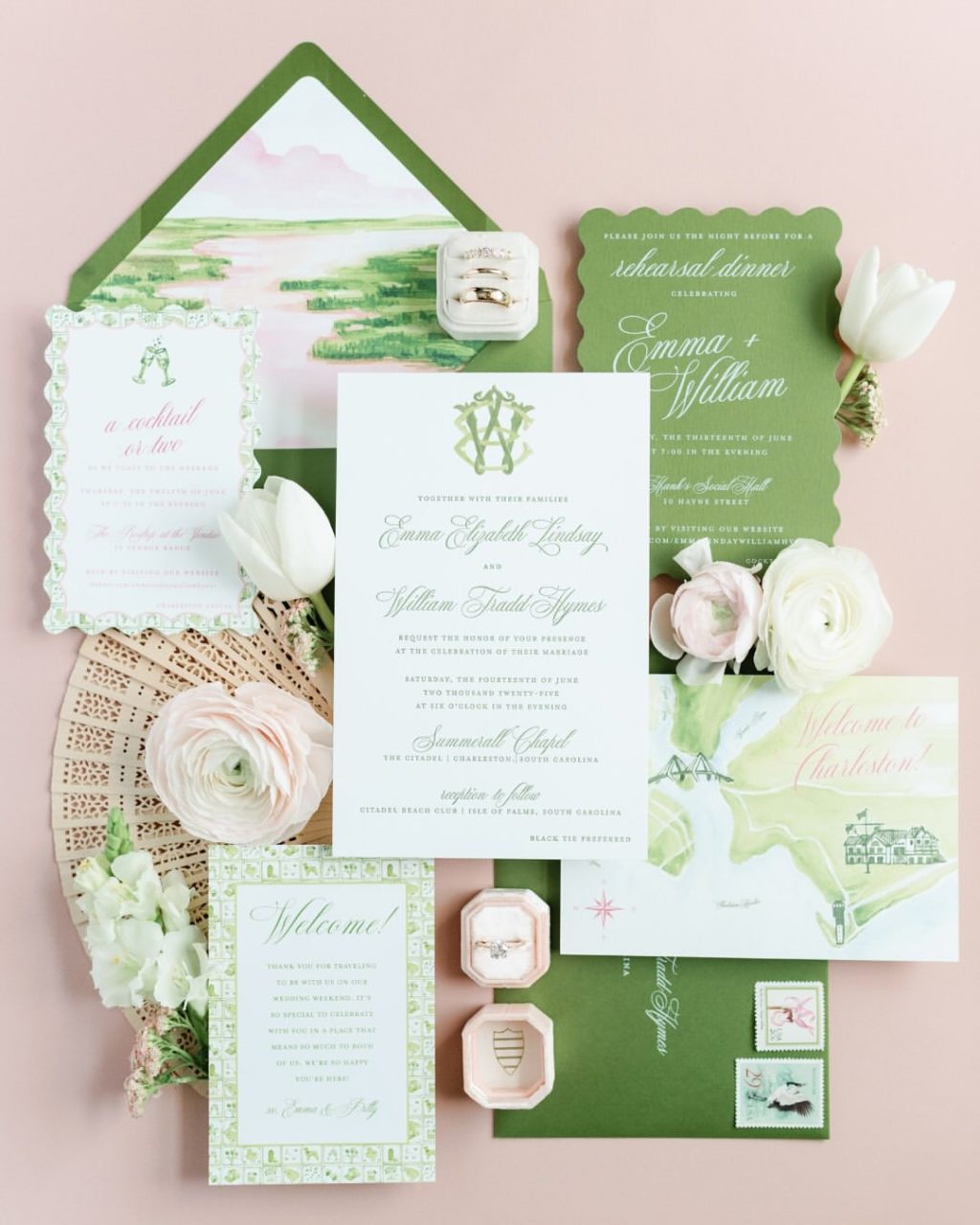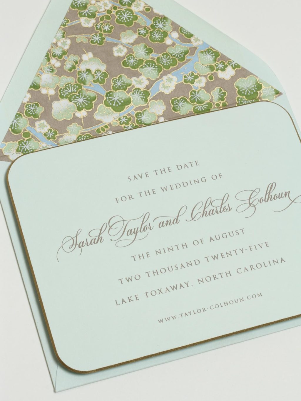 Elegant Green Save the Date Wedding Card with Floral Envelope Liner