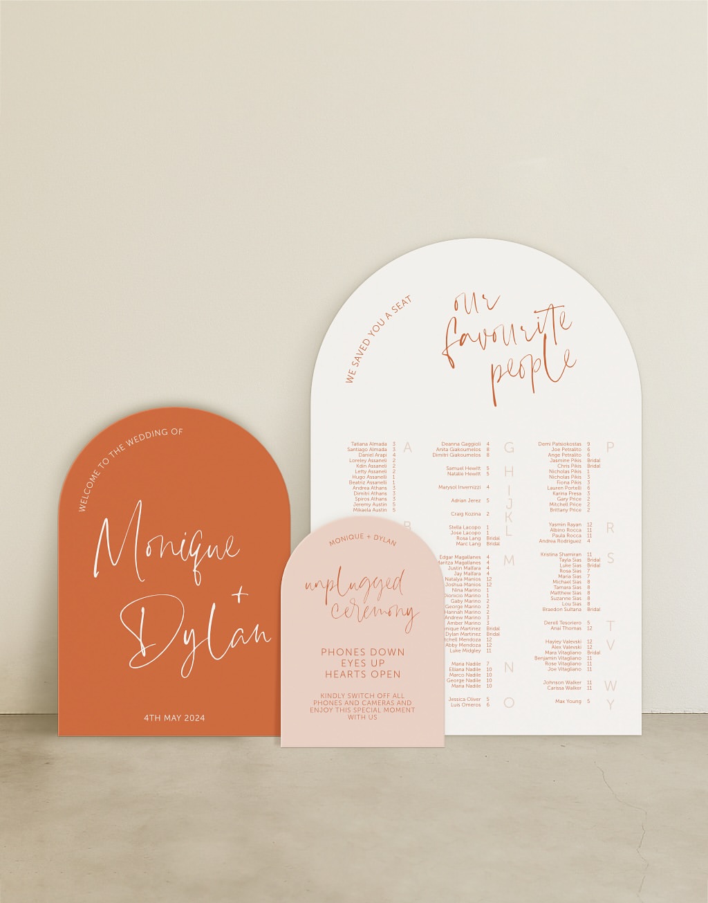 Modern terracotta wedding welcome sign set with seating chart and unplugged ceremony board